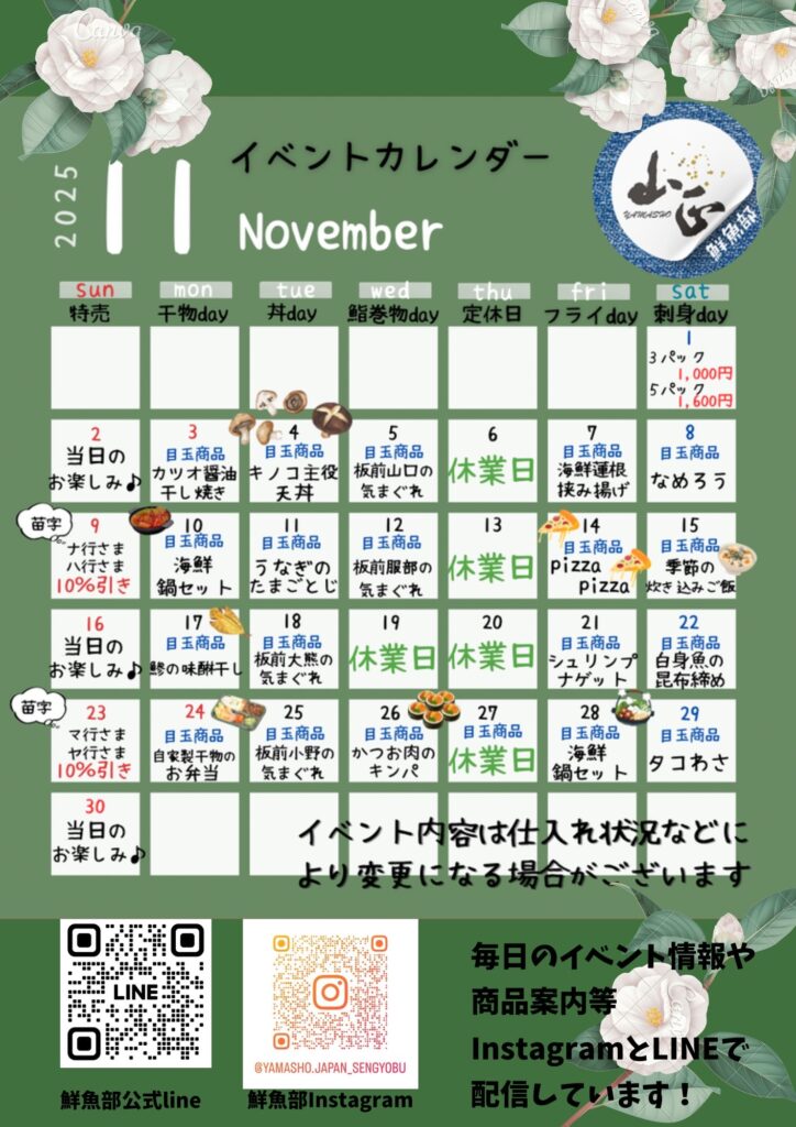 【山正鮮魚部】 2025年11月のイベントカレンダーができました!今月もお得が満載!