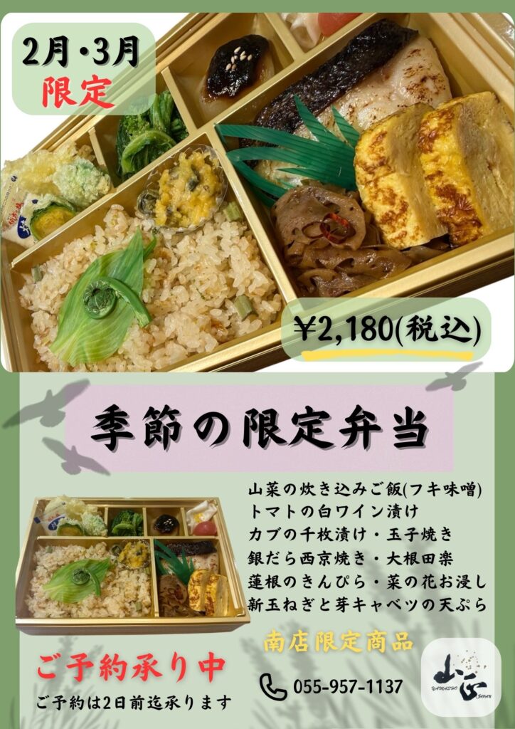 さて、当店(南店)では2月・3月の期間限定で、春の食材をふんだんに盛り込んだ「季節の限定弁当」を販売いたします。